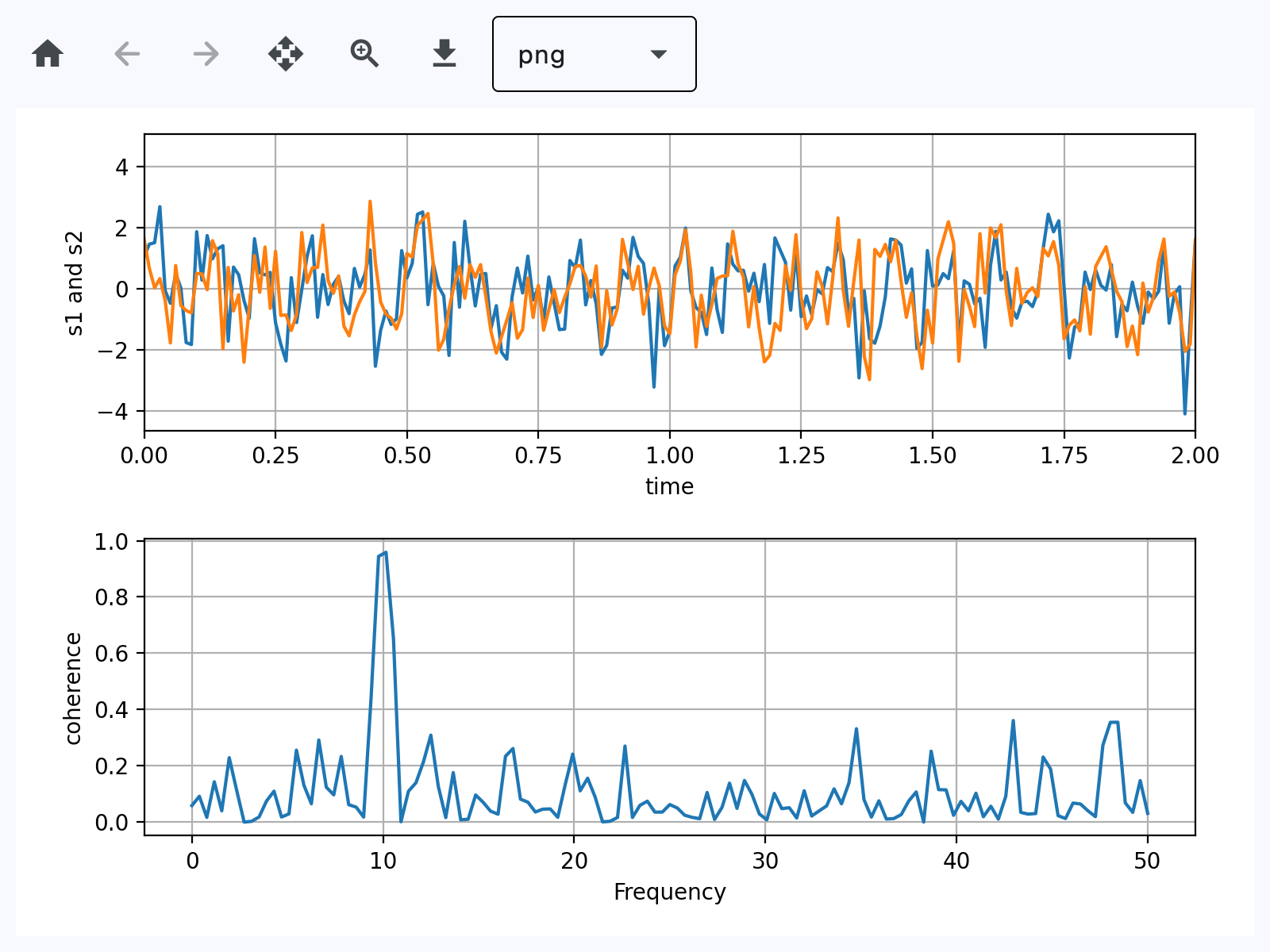 # Two signals with a coherent part at 10Hz and a random part